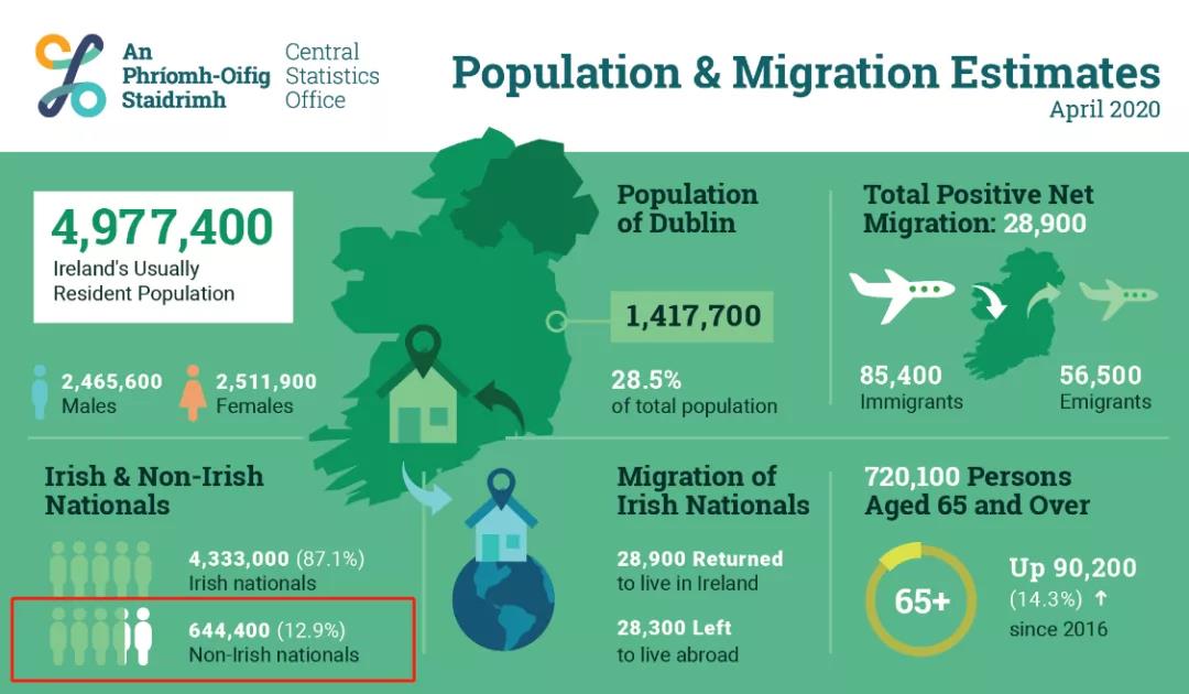 據(jù)愛爾蘭中央統(tǒng)計局發(fā)布的最新數(shù)據(jù),截至2020年4月,愛爾蘭共有498萬居民,其中外國移民增至64.44萬人,占愛爾蘭總?cè)丝诘?2.9%。