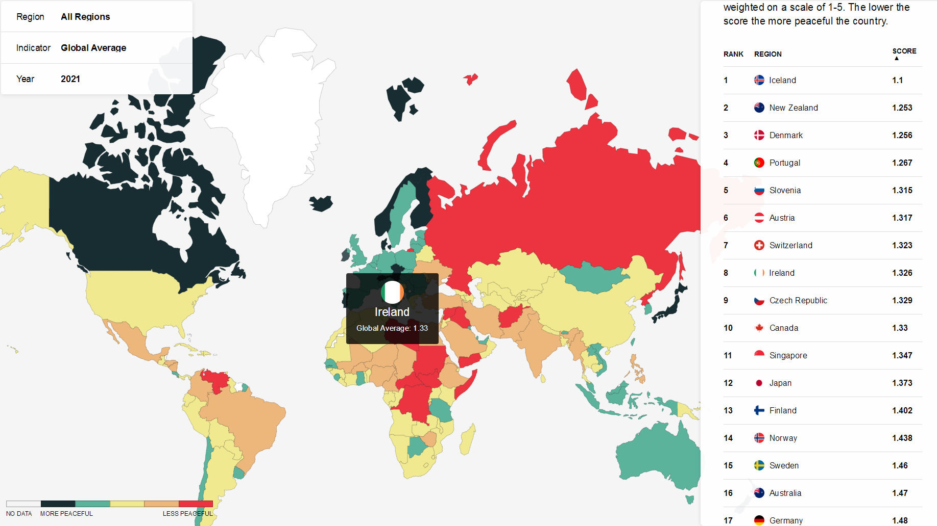 2021年,冰島再次蟬聯(lián)全球最和平國家,新西蘭、丹麥緊隨其后,分獲第2、第3名。對比2020年排名,新加坡跌出前十,愛爾蘭前進3位取而代之。此外,日本排名第12,澳大利亞排名16,英國排名33,而美國排在第122名。