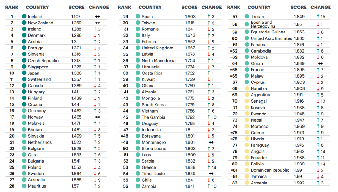 其中,冰島被評為世界上最和平的國家,其次便是新西蘭(第二名)和愛爾蘭(第三名)。