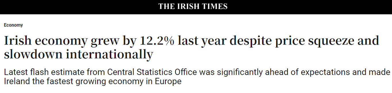 盡管全球經(jīng)濟(jì)大幅放緩,但愛(ài)爾蘭經(jīng)濟(jì)卻仍高速增長(zhǎng)12.2%,大大超過(guò)政府預(yù)期,再次成為歐盟增長(zhǎng)最快的經(jīng)濟(jì)體,幾乎是排名第二的葡萄牙(6.5%)的兩倍,是歐盟平均水平(3.3%)的近四倍。