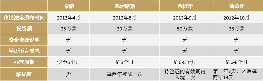 購(gòu)房拿綠卡基本集中在一些歐洲國(guó)家,也是國(guó)內(nèi)投資人選擇最多的地方。2008年金融危機(jī)出現(xiàn)以后,為了拉動(dòng)經(jīng)濟(jì),歐盟諸國(guó)相繼推出了購(gòu)房移民政策,比較知名的就是葡萄牙、西班牙、希臘、塞浦路斯等。