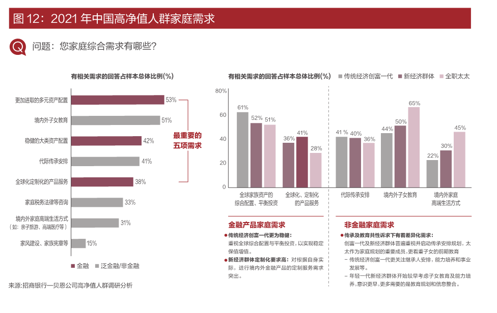 高凈值家庭全職太太作為家庭規(guī)劃重要成員,更看重子女教育,對于境內(nèi)外子女教育需求占比高達65%。此外,醫(yī)療健康、高端生活方式、稅務法律咨詢等需求正在崛起。