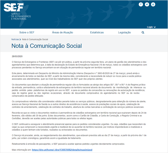葡萄牙移民局將目前處于等待狀態(tài)的移民身份合法化,所有在葡萄牙移民局已經(jīng)提出申請的外國公民身份都將在葡萄牙本國得到承認(rèn),只需持有在3月18日宣布國家緊急狀態(tài)之日前向移民局提出的申請憑證。此類文件可充當(dāng)臨時居留,持有此類文件在葡居留將視為合法居留,可享受本國所有醫(yī)療保障及社會保障等。