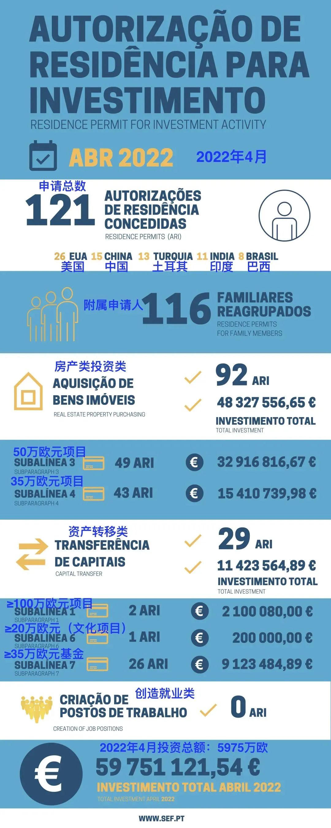 葡萄牙移民局(SEF)最新公布的黃金簽證數(shù)據(jù)顯示:2022年4月,共有121位主申請人和116位附屬申請人獲批葡萄牙黃金簽證,投資額為5975萬歐元。其中,來自美國的主申請人為26人,其次是中國(15人)、土耳其(13人)、印度(11人)、巴西(8人)。