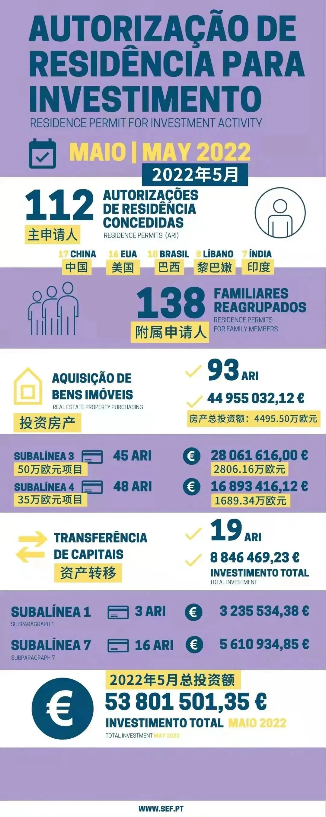 近日,葡萄牙移民局更新了5月份的黃金簽證數據:2022年5月共計112位主申請人和138位附屬申請人獲批葡萄牙黃金簽證,投資額為5380萬歐元。同比4月,主申請人數略微下降,附屬申請人上升。
