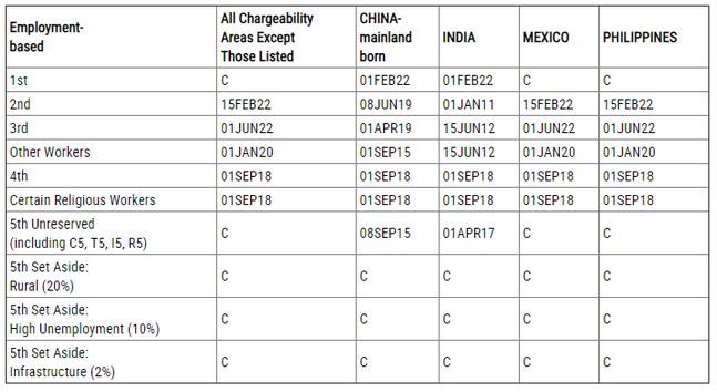 EB-3:技術類專業勞工排期為2019年4月1日,無變化;非技術勞工排期為2015年9月1日,前進139天