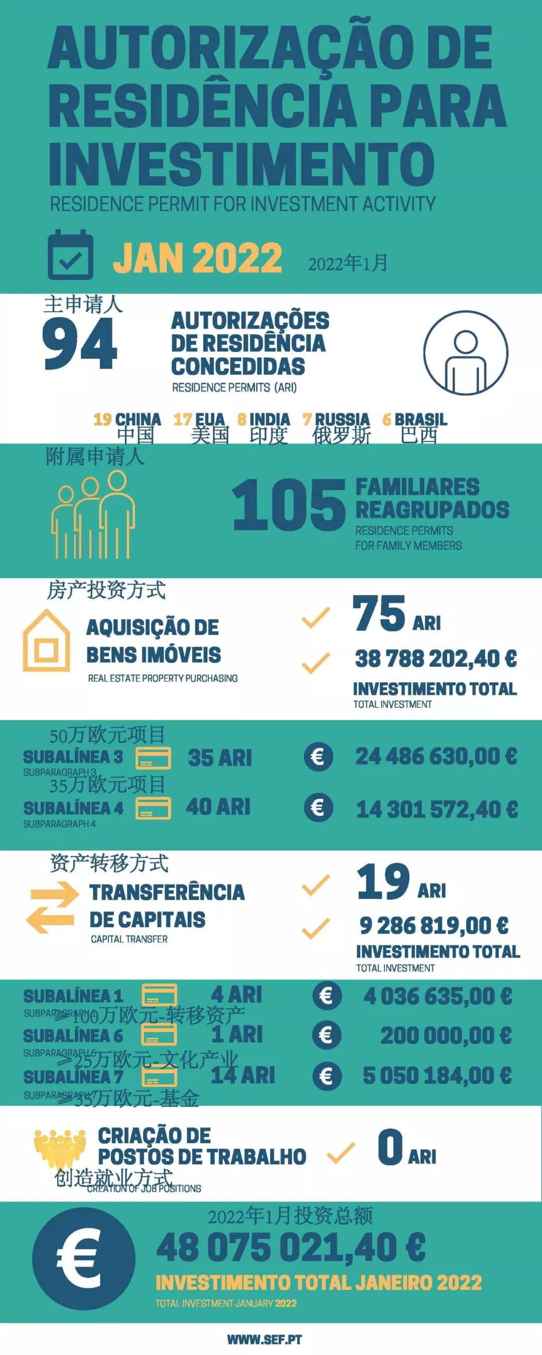 日前,葡萄牙移民局(SEF)公布了2022年1月的黃金簽證數據。2022年1月,共有94名主申請人連同他們的105名家屬獲得了葡萄牙黃金簽證,這一數據相較于去年12月增加了12%,相較于去年同期增加了71%。1月投資總額達到4807萬歐元,去年12月是4200萬歐元,去年同期是3300萬歐元。