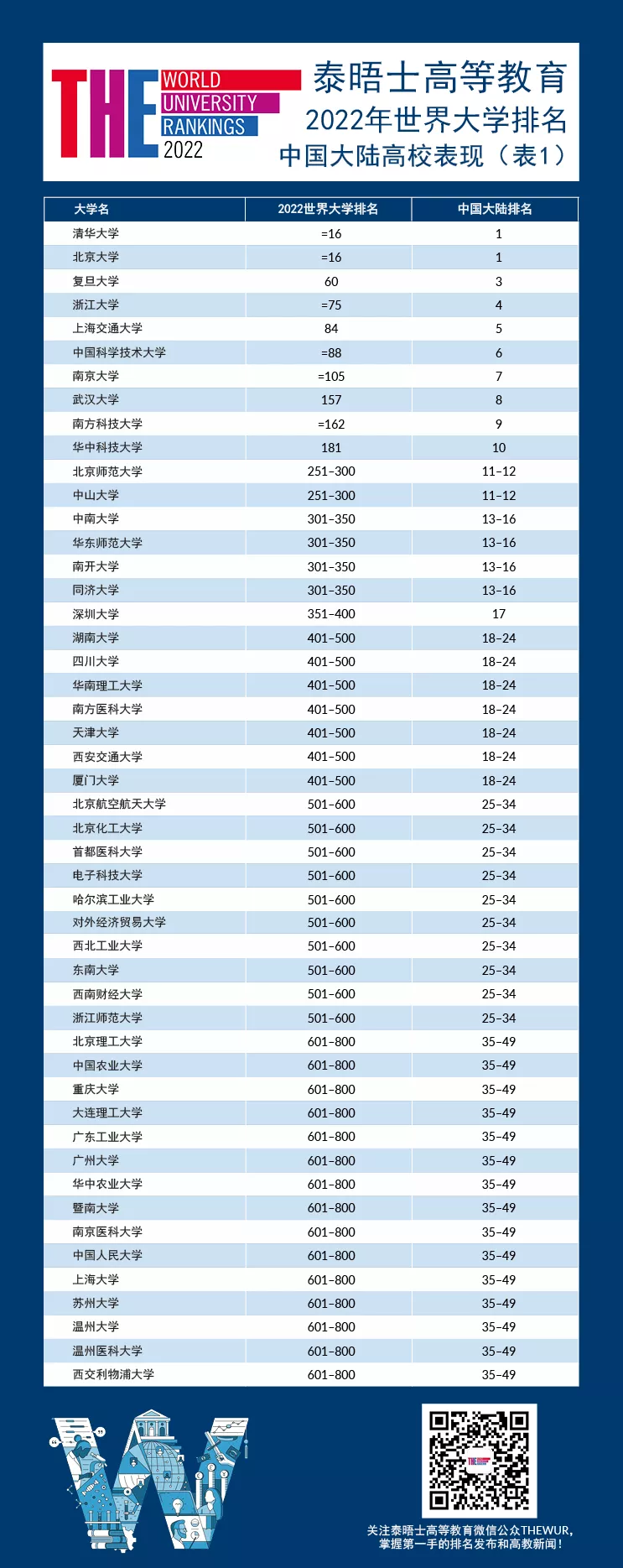 北京時間2021年9月2日,泰晤士高等教育(Times Higher Education)公布了THE 2022年度世界大學排名。英國牛津大學連續第六年蟬聯榜首。清華大學和北京大學并列排名第16位,位列亞洲地區高校第一,這是中國大陸高校在該排行榜上有史以來的最高排名。